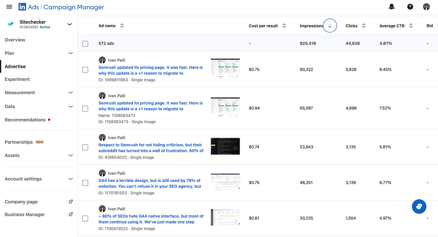 For now, these ads are our main channel for attracting customers. According to my statistics, the ideal thought leader post has a CTR of 8-10%. In this case, for the US market, a click costs about $0.7-$0.8.