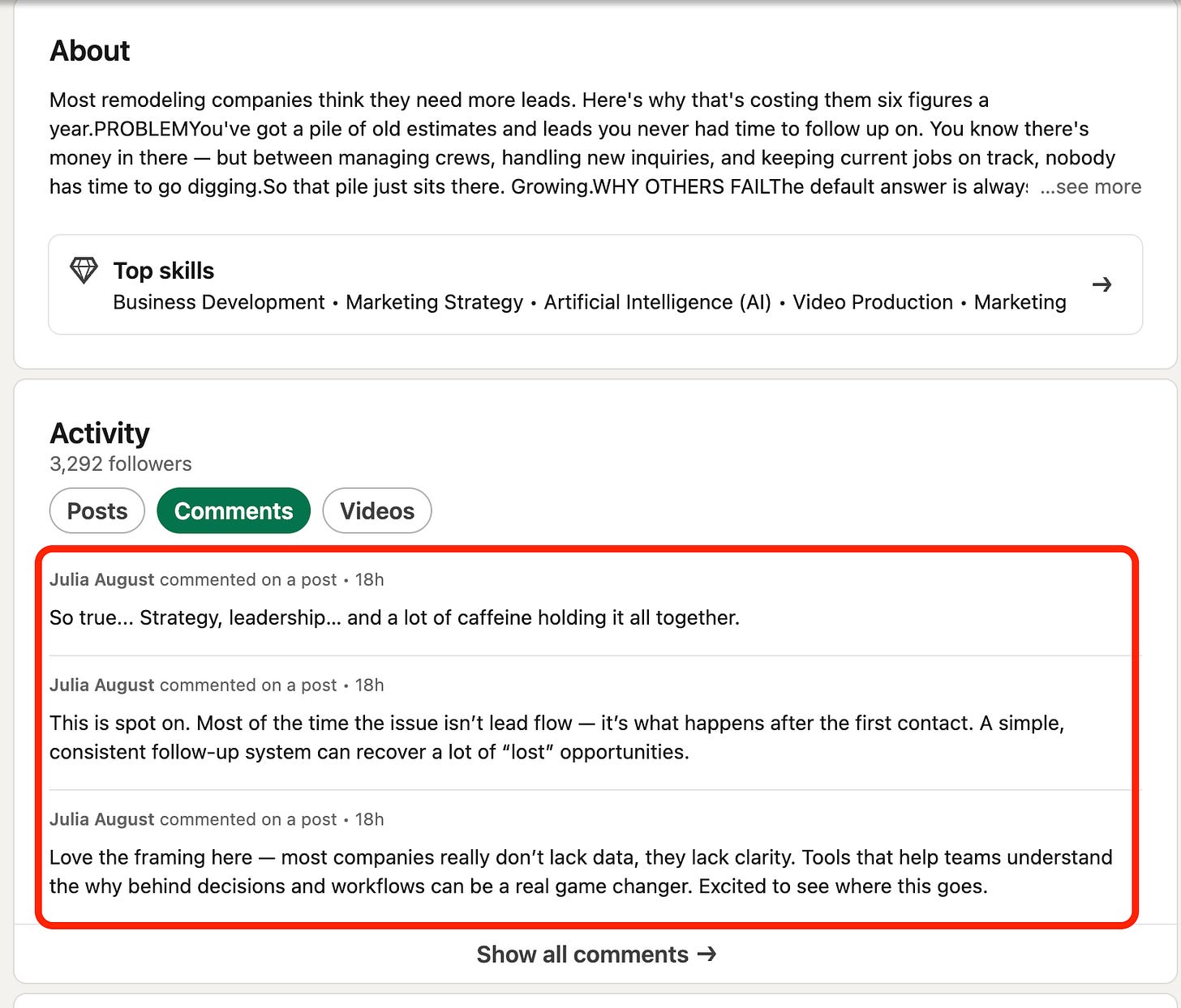 About 50% of the comments I receive under my posts are AI comments. The most unpleasant thing is that even CEOs, founders, and C-levels of normal companies often resort to this automation, not just freelancers who want to offer you links.