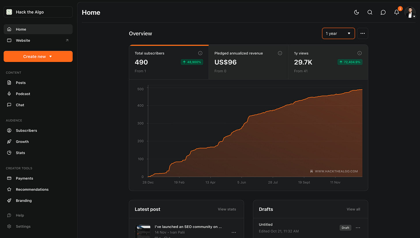 This newsletter, Hack the Algo, grew to 500 subscribers, and this is a bad result. The reason is a few emails. Intellectually, this is the most difficult type of content.